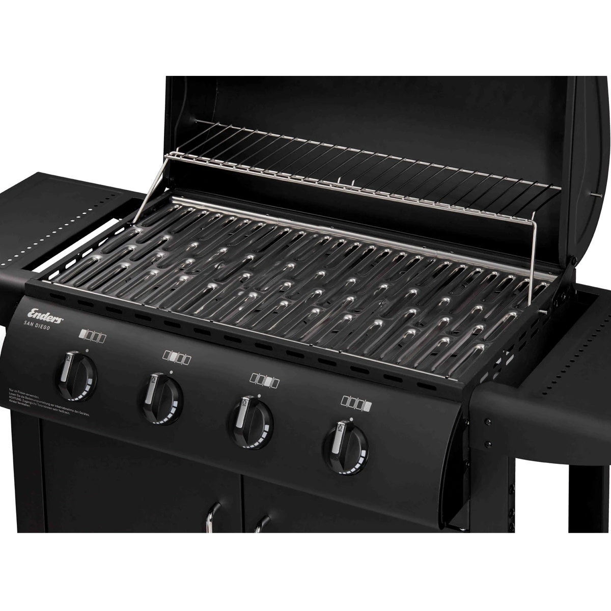 Der kompakte San Diego 4 Gasgrill von Enders ist mit bestens gerüstet für kräftig gegrillte Spezialitäten, macht aber auch beim indirekten Grillen eine tolle Figur. Unter der ist Platz für abwechslungsreiche BBQ-Ideen und ganze Grillmenüs, der mitschwingende Warmhalterost bietet zusätzliche Grillfläche zum Warmhalten und Nachgaren.