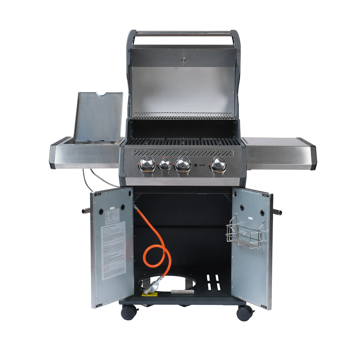 In der linken Ablage des Grills ist ein Seitenkocher integriert. Der Seitenkocher hat ein Kochfeld, auf dem Ihr mühelos Beilagen zubereiten könnt. Den Wok oder die Grillpfanne heizt Ihr mit satten 4 kW ein. Damit wird aus dem S 301 eine kleine Außenküche, mit der sich umfangreiche Menüs grillen und kochen lassen.