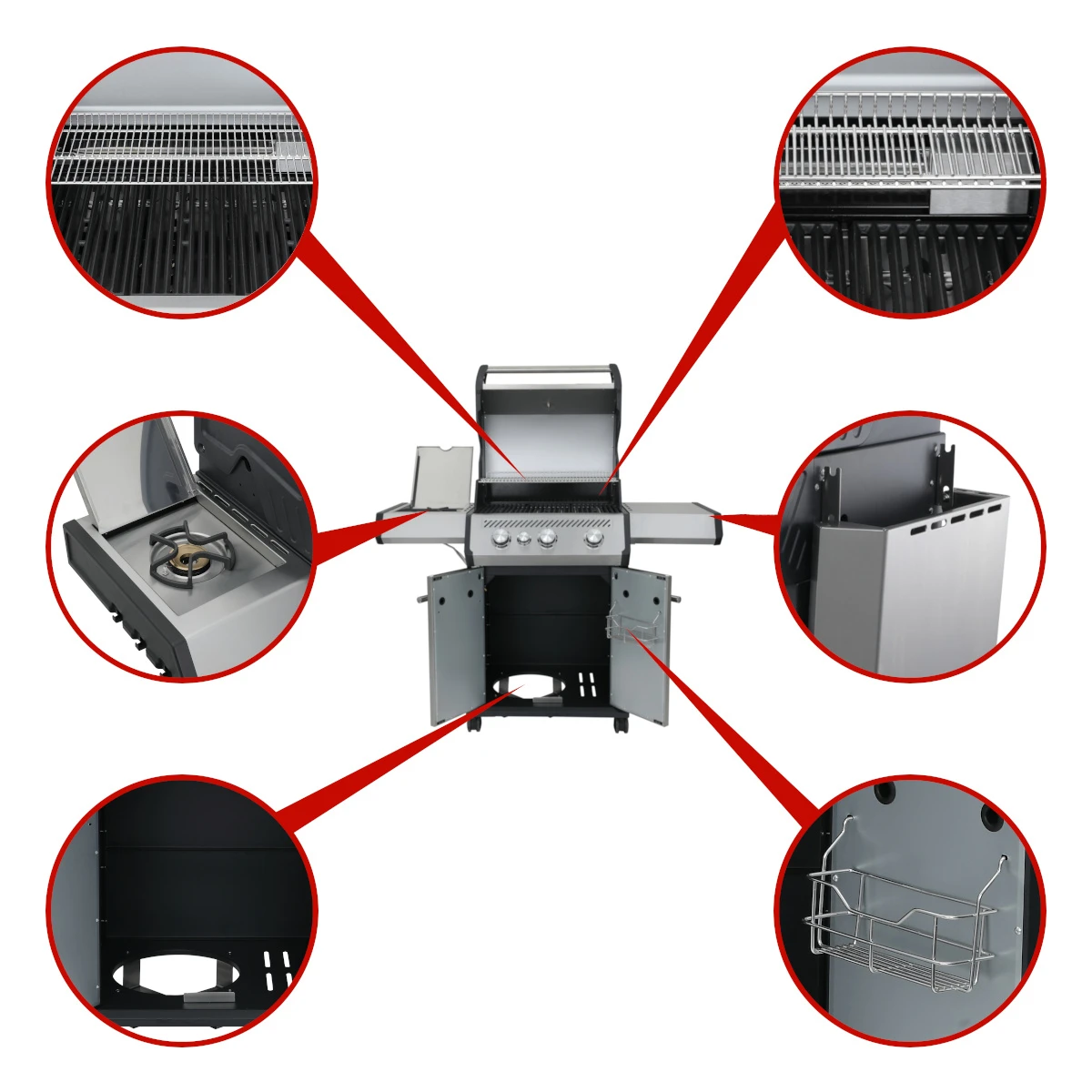Die qualitativ hochklassigen Brenner aus Edelstahl haben eine Gesamtleistung von 10,5 kW und sind im robustem mit eingebaut. In dem Brennergehäuse wird die Hitze besonders gut von Umwelteinwirkungen wie Kälte isoliert. Das mit extra flachen Flammenverteilern sorgt für eine gleichmäßige Hitzeverteilung unter dem Grillrost und in der Garkammer. Die Flammenverteiler funktionieren ebenso als Schutz für die Brenner, damit diese durch hinunter tropfenden Saft bzw. Fett nicht verstopfen.